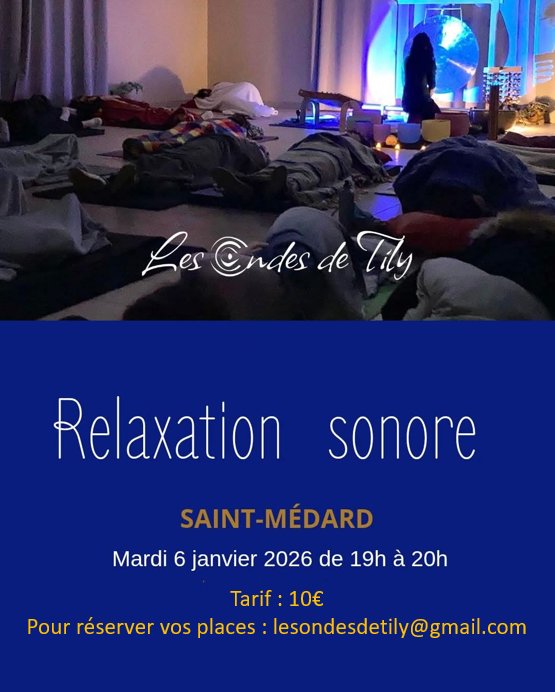 Une séance de relaxation sonore vous est proposée par Katily PRERA (Les Ondes de Tily), à la salle des fêtes de Saint-Médard le mardi 6 janvier à 19h00.