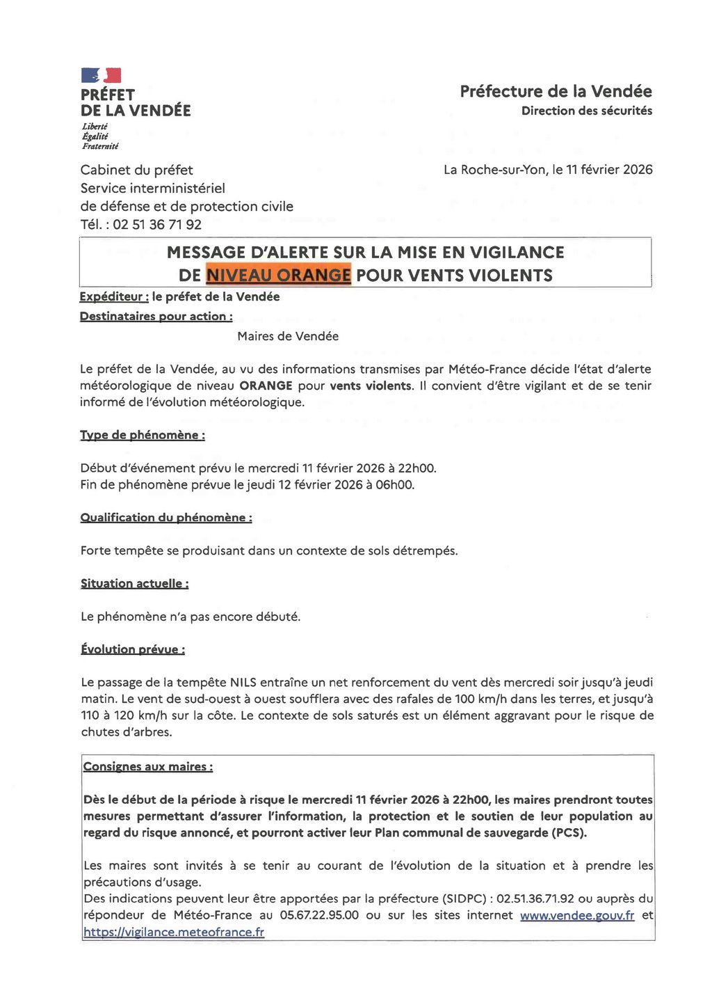 Vous trouverez en pièce jointe la mise en alerte météorologique pour vents violents de niveau orange signée par Monsieur le Préfet de la Vendée.