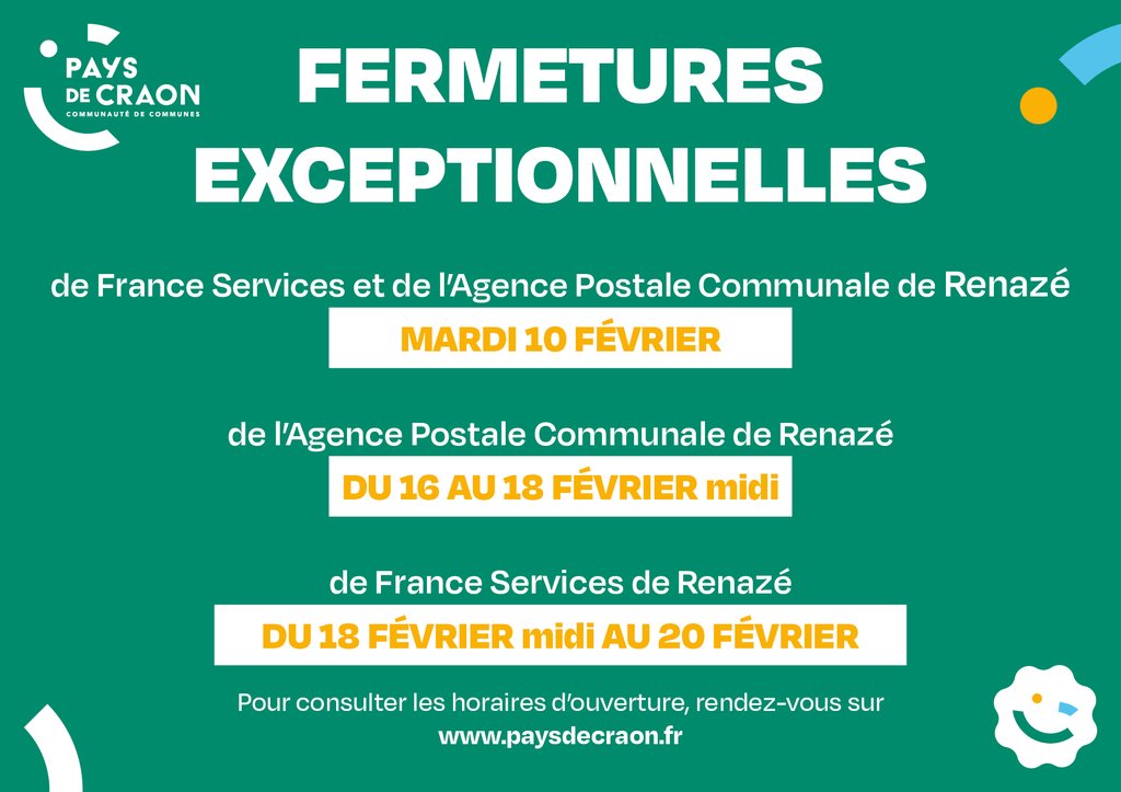 Nous vous informons des fermetures exceptionnelles de l'agence France Services et de l'Agence Postale Communale de Renazé 𝗽𝗼𝘂𝗿 𝗹𝗲 𝗺𝗼𝗶𝘀 𝗱𝗲 𝗳𝗲́𝘃𝗿𝗶𝗲𝗿 :
