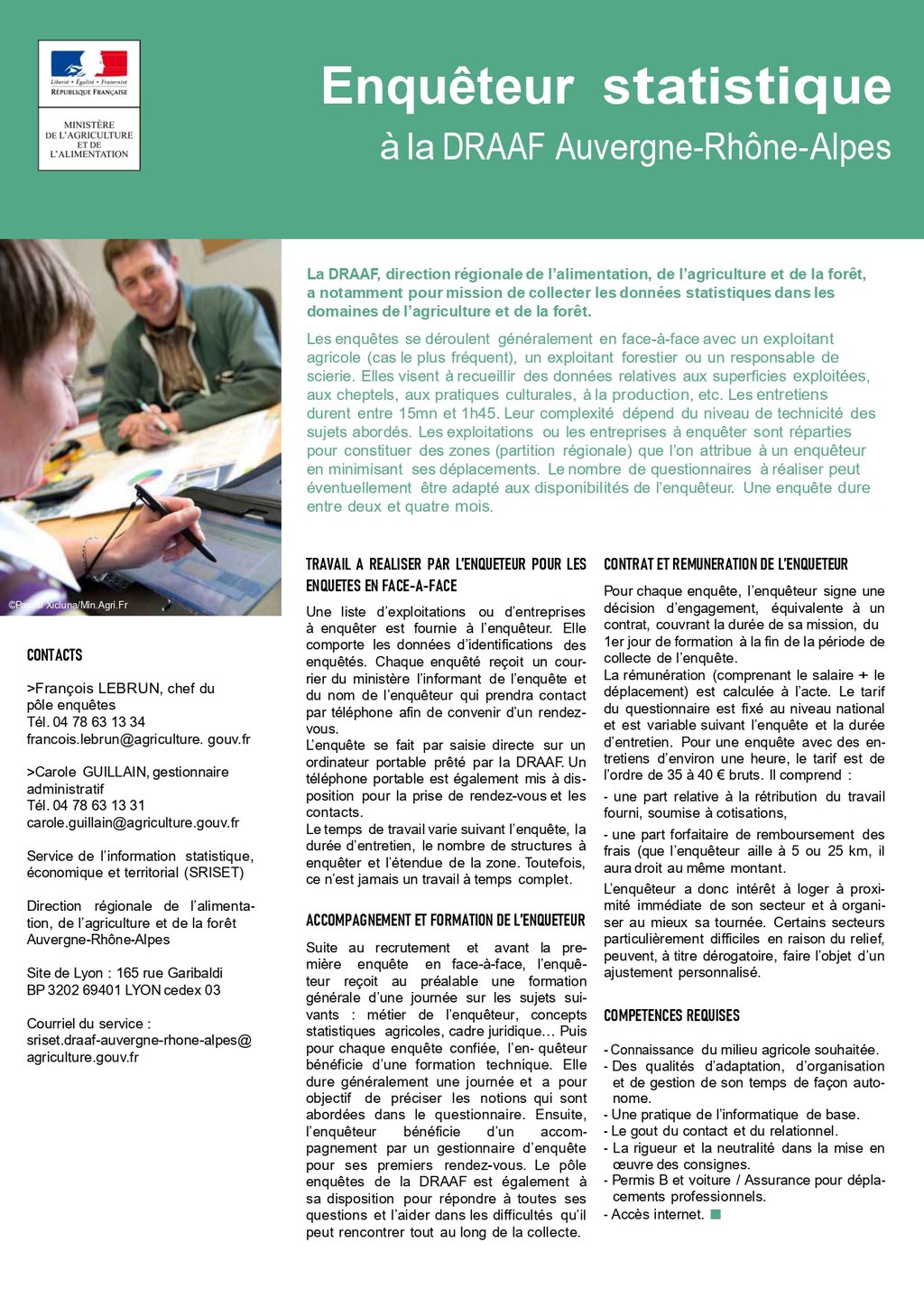 Le service régional de l'information statistique et économique de la DRAAF Auvergne - Rhône-Alpes souhaite recruter des enquêteurs de la statistique agricole publique afin de mener des enquêtes sur des thématiques généralement liées à l'agriculture et la forêt. Les données recueillies sont essentielles pour piloter les politiques agricoles nationales et européennes.