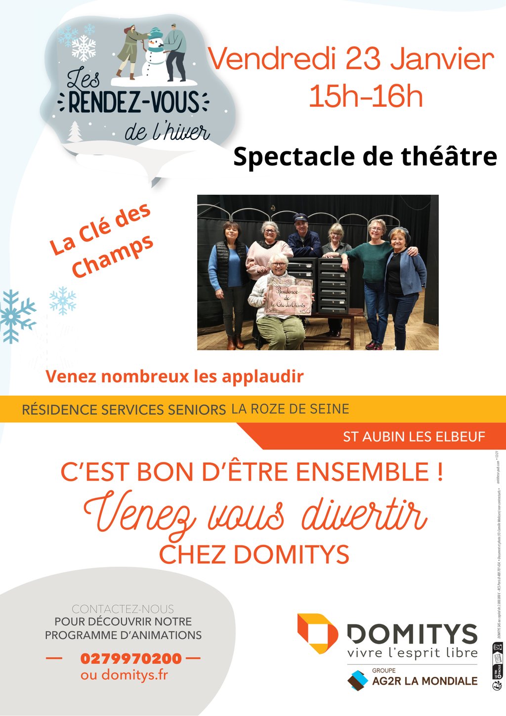 Venez applaudir la troupe "La clé des champs" le vendredi 23 janvier à partir de 15 h 00, au sein de notre résidence Domitys, située au 12 Rue André Gantois. Entrée gratuite