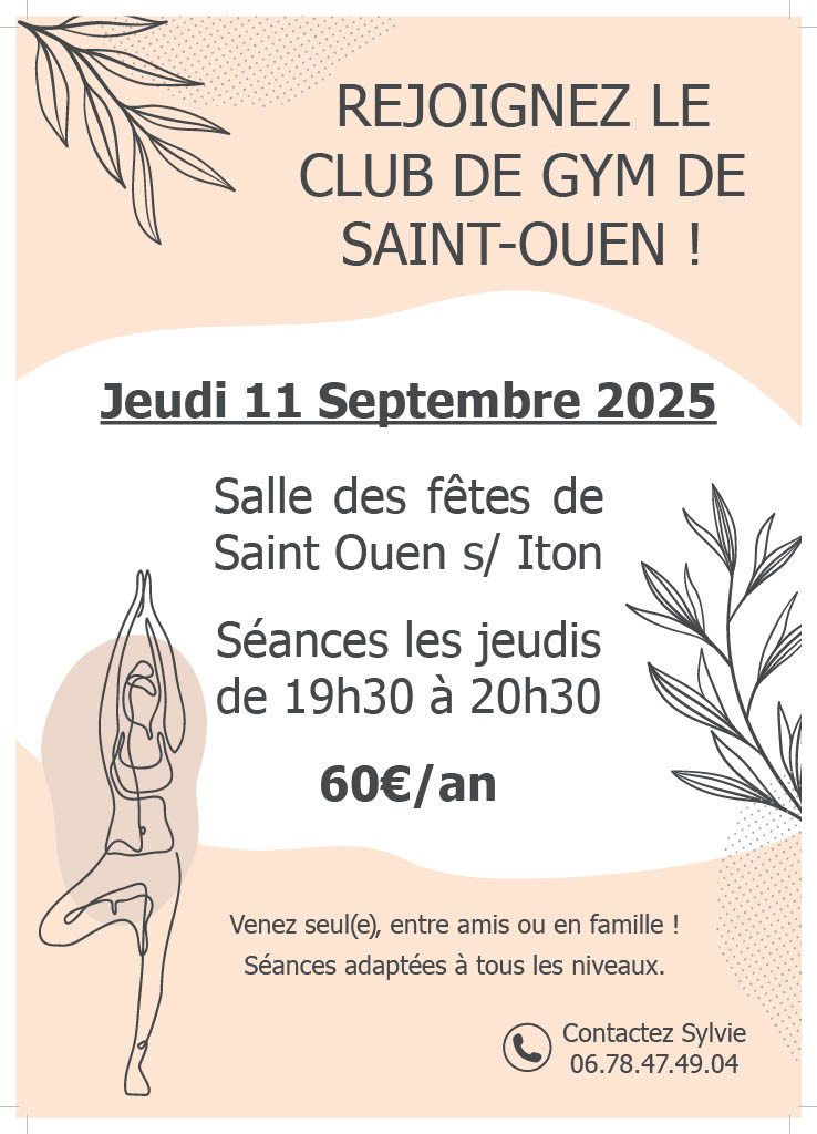 Rejoignez le club de gymnastique de SAINT OUEN SUR ITON le jeudi 11 septembre 2025 à la salle des fêtes.