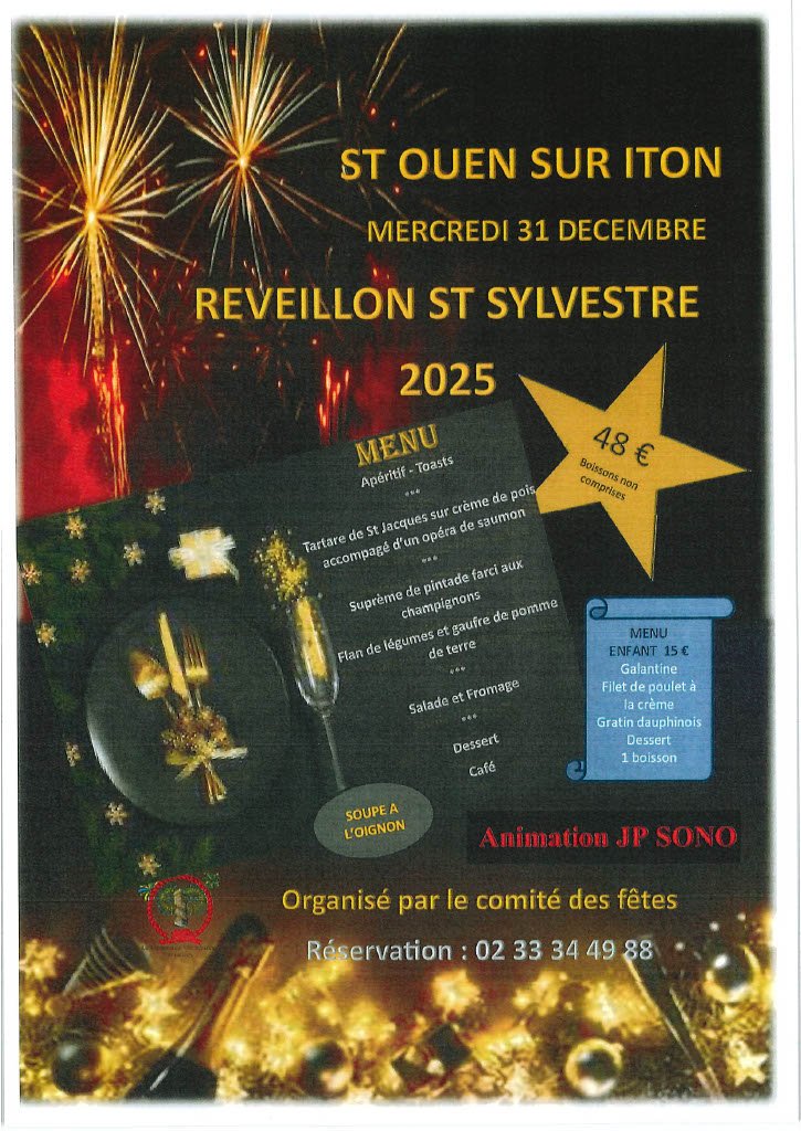 Le Comité des Fêtes organise le réveillon du Nouvel An le mercredi 31 décembre 2025 à la salle des fêtes de SAINT OUEN SUR ITON.