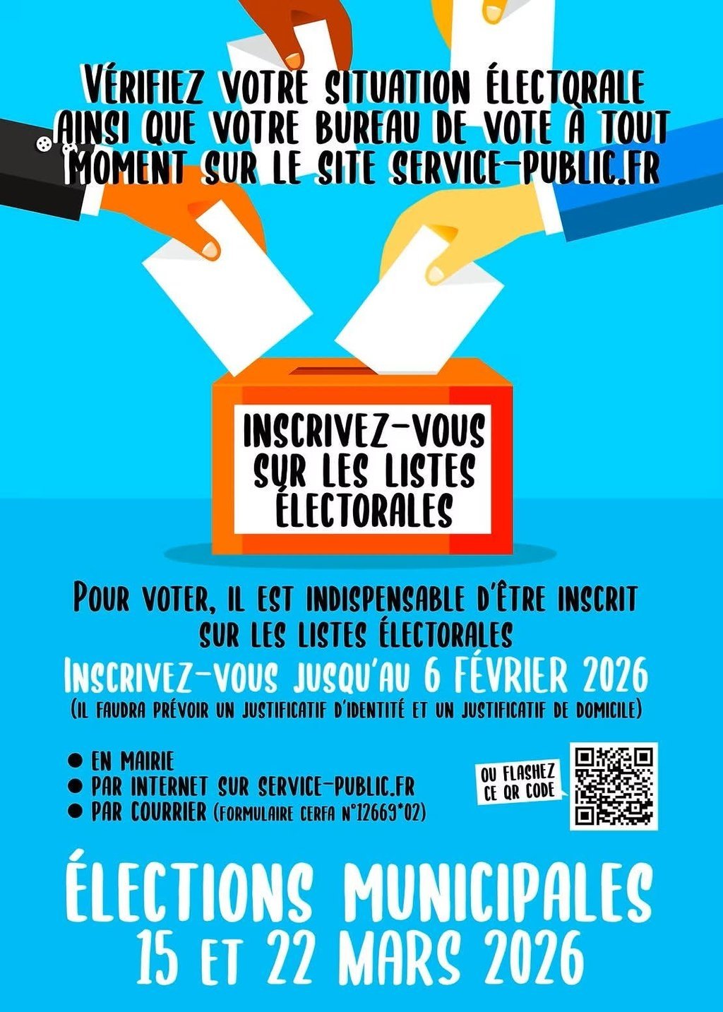 Le scrutin des élections municipales se déroulera les dimanche 15 et 22 mars 2026 de 8h à 18h.