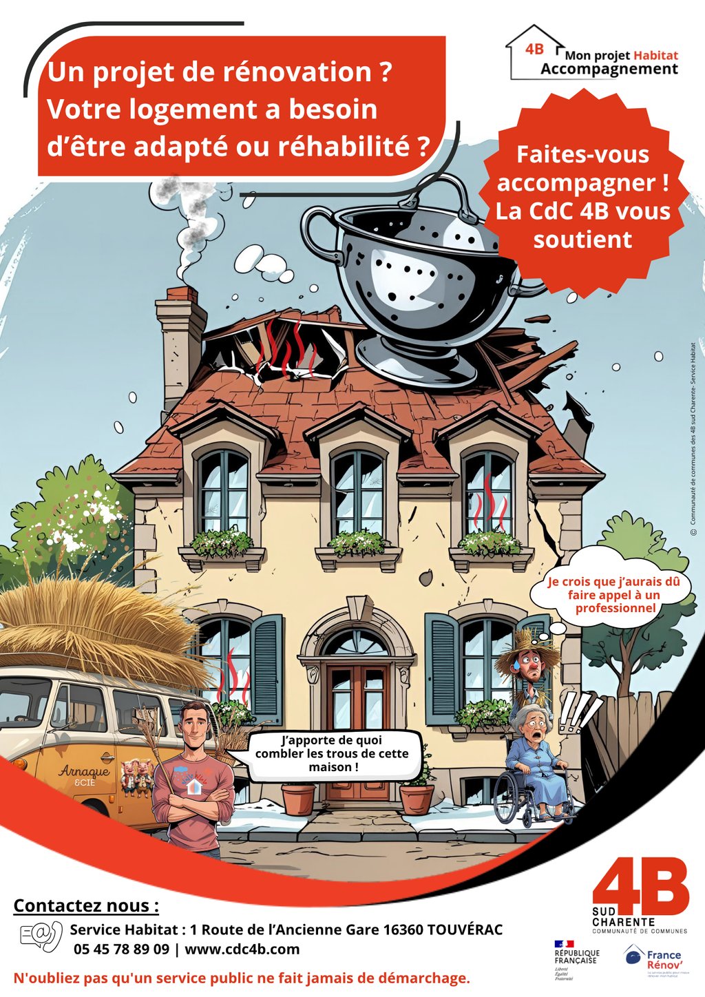 La Communauté de communes des 4B sud Charente vient de lancer le dispositif "Mon Projet Habitat : accompagnement sur mesure", destiné à vous accompagner dans vos démarches de projets de rénovation, d’adaptation ou d’amélioration de leur logement.