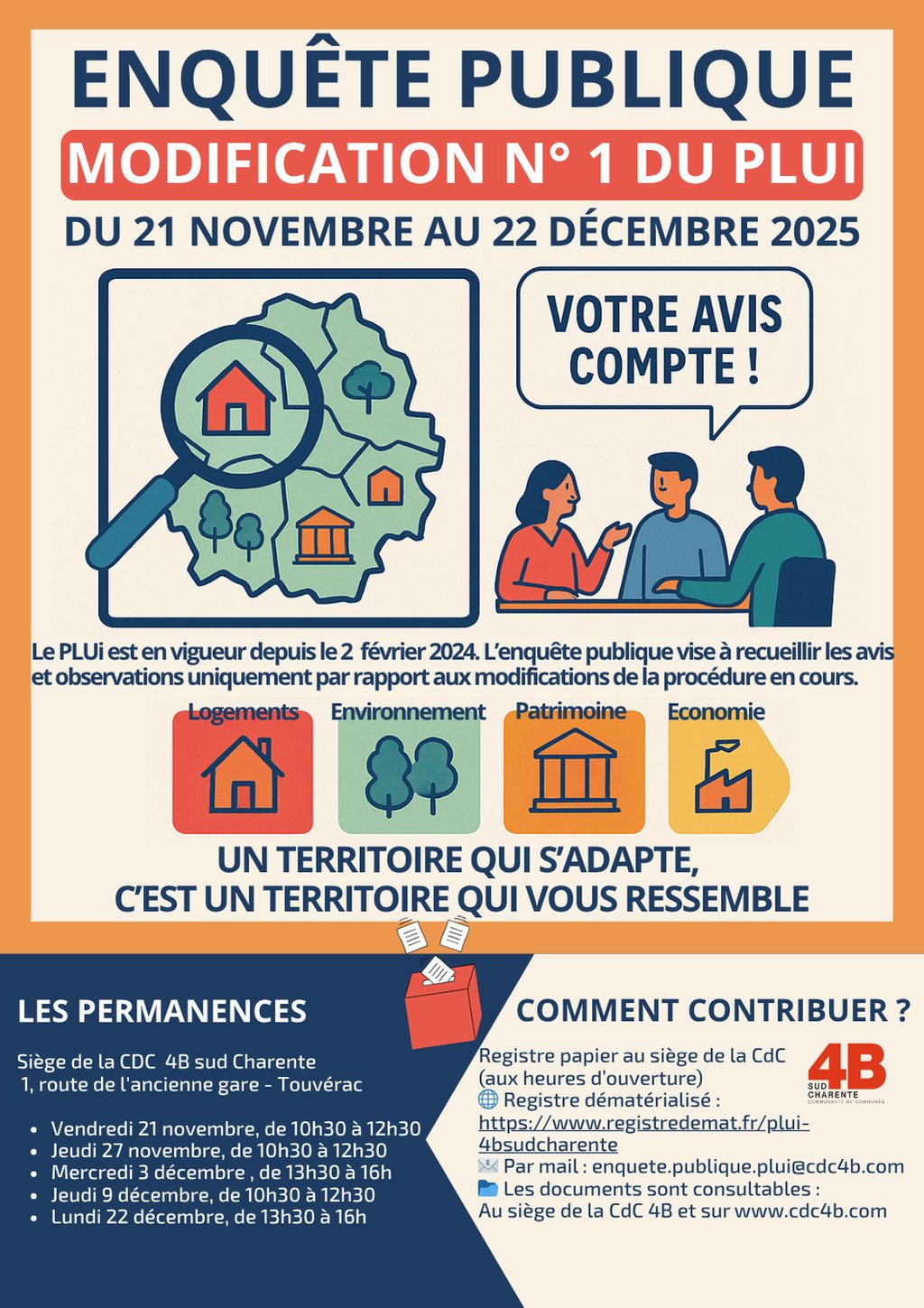 Je vous prie de trouver le communiqué de presse concernant l'enquête publique sur la modification n°1 du Plan Local d'Urbanisme Intercommunal (PLUi) de la CDC4B.