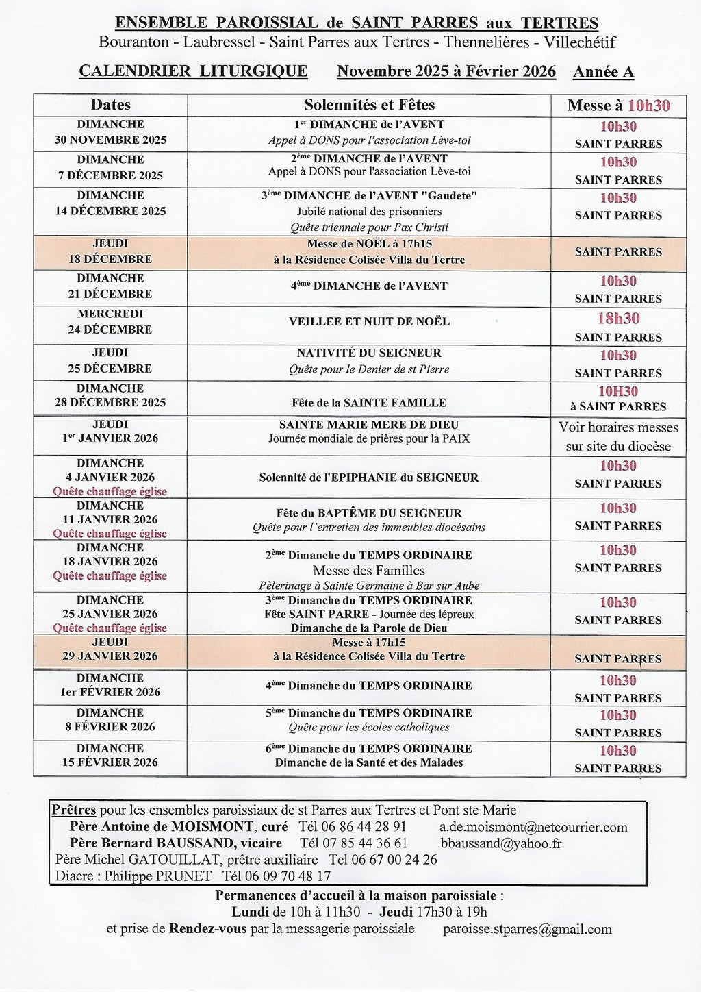 Calendrier et horaires des messes sur l'ensemble Paroissial de Saint-Parres aux Tertres, Villechétif, Laubressel, Bouranton et Thennelières.