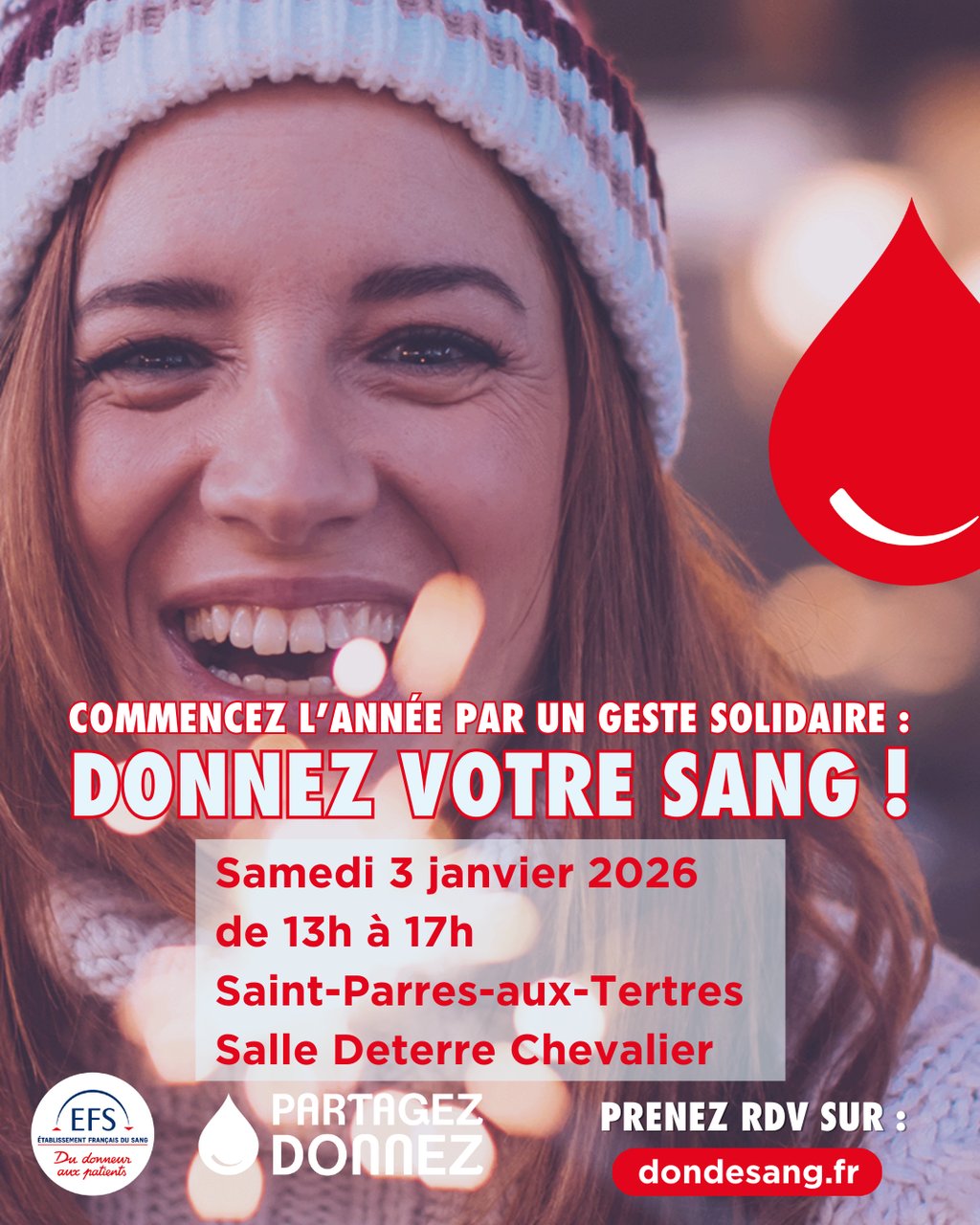 Don du sang à Saint Parres le samedi 3 janvier de 13h à 17h à la salle Deterre Chevalier