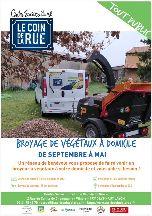 Un service de broyage de végétaux à domicile est proposé par le Centre Socioculturel "Le Coin de la Rue" de Vihiers, allant de septembre à mai.
