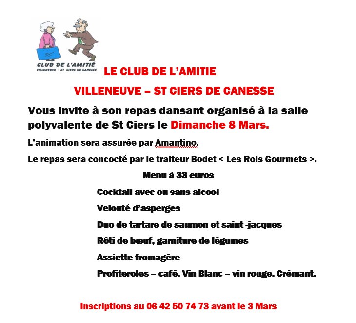 Le Club de l’Amitié de Villeneuve - Saint-Ciers-de-Canesse vous convie à un repas dansant le dimanche 8 mars à la salle polyvalente de Saint-Ciers-de-Canesse. Une occasion idéale pour partager un moment convivial autour d’une table généreuse et dans une ambiance musicale entraînante.