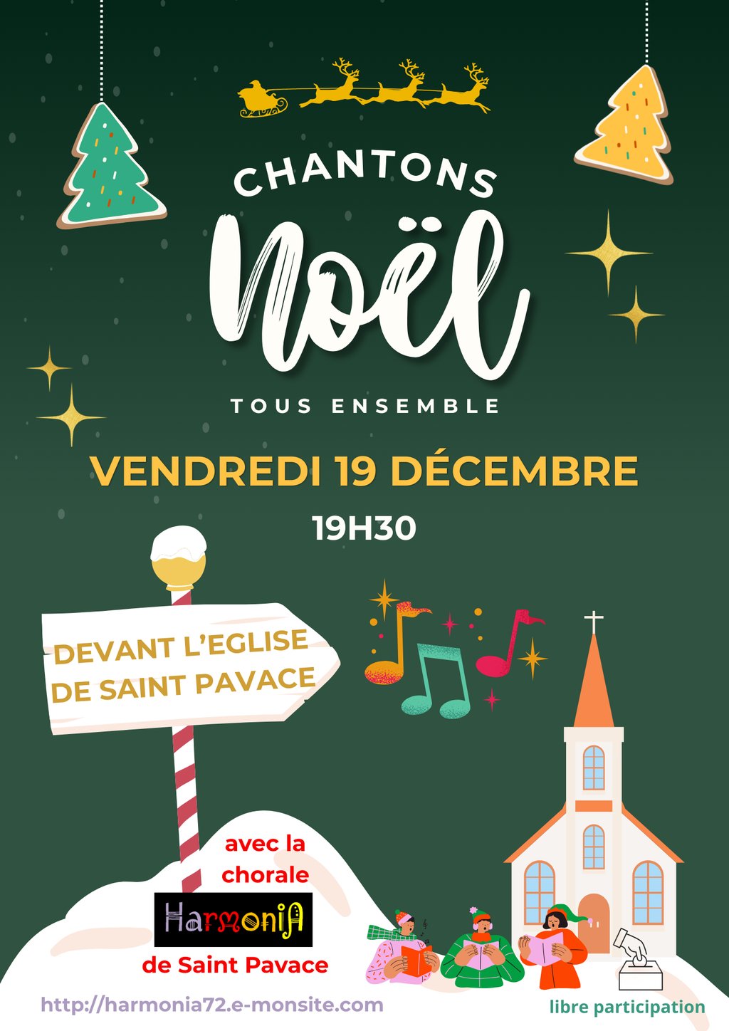 Habitants de Saint Pavace et alentour, venez tous chanter des airs de Noël plus ou moins connus avec la chorale Harmonia de Saint Pavace, sous la direction de sa nouvelle cheffe Pauline Pelosi.