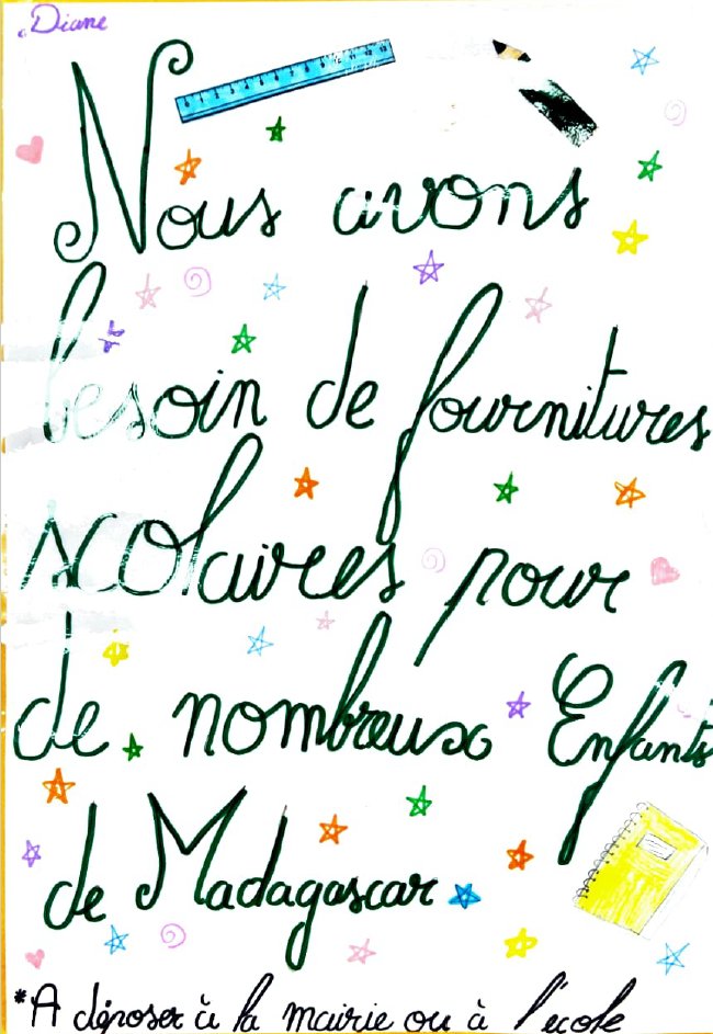 Dans le cadre des actions menées par le Conseil Municipal Enfant, un appel aux dons est lancé pour récolter des fournitures scolaires qui seront ensuite envoyées aux enfants de Madagascar.