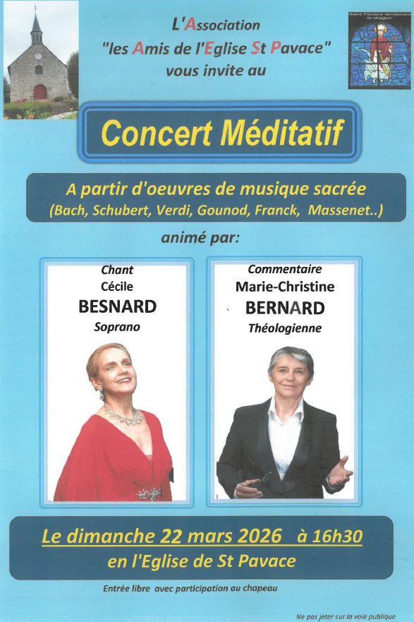 L’Association des amis de l’église de Saint Pavace organise, ce dimanche 22 mars à 16h30 en l’église de la commune, un Concert Méditatif.