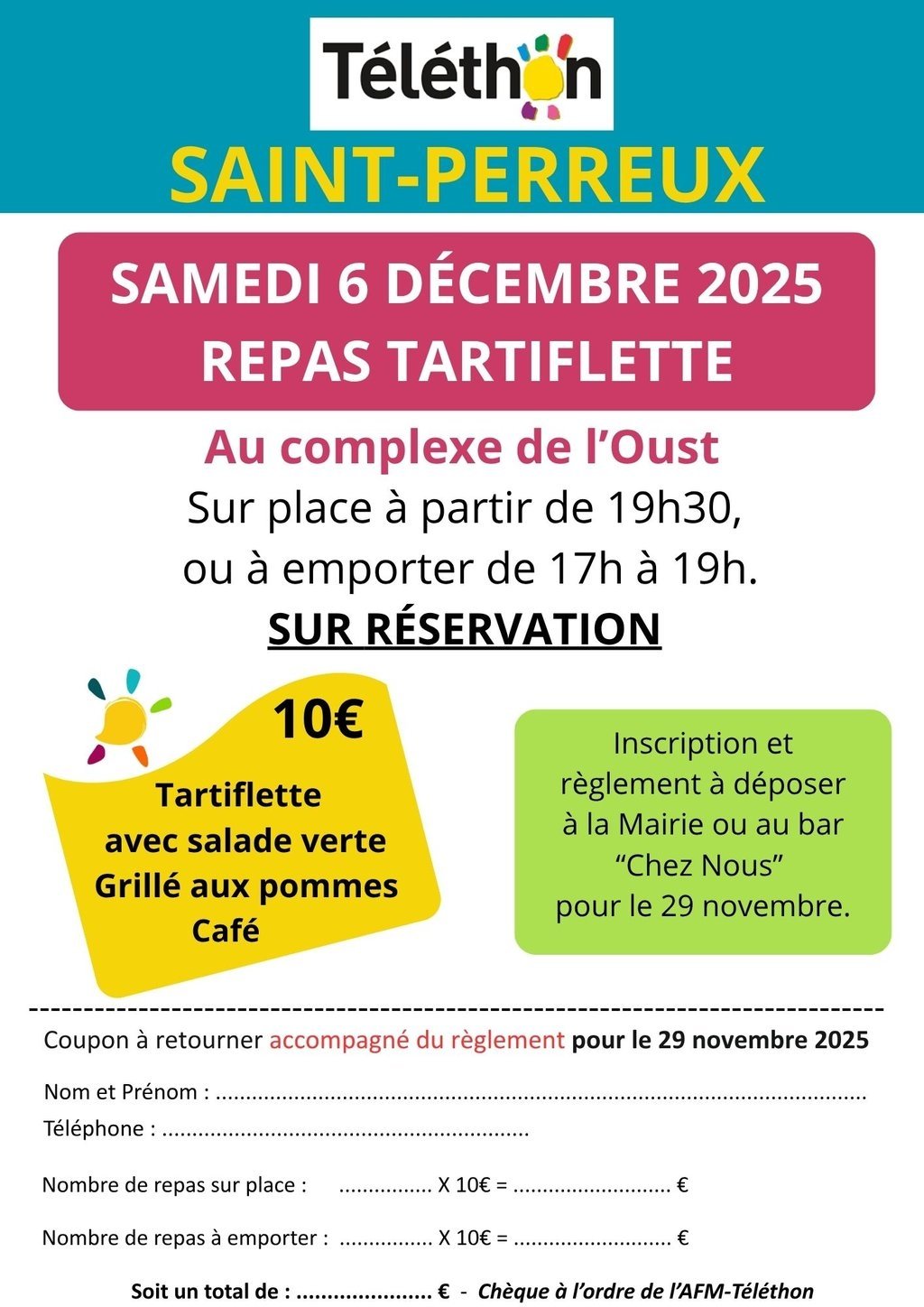 Repas Tartiflette 10€, sur place ou à emporter,