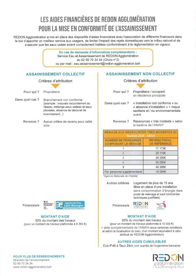 Redon Agglomération a mis en place des dispositifs d'aides financières avec l'association de différents financeurs dans le but d'apporter un meilleur service aux usagers, de limiter l'impact des rejets domestiques vers le milieu naturel et de s'assurer que les aux usées soient correctement traitées conformément à la règlementation en vigueur.
