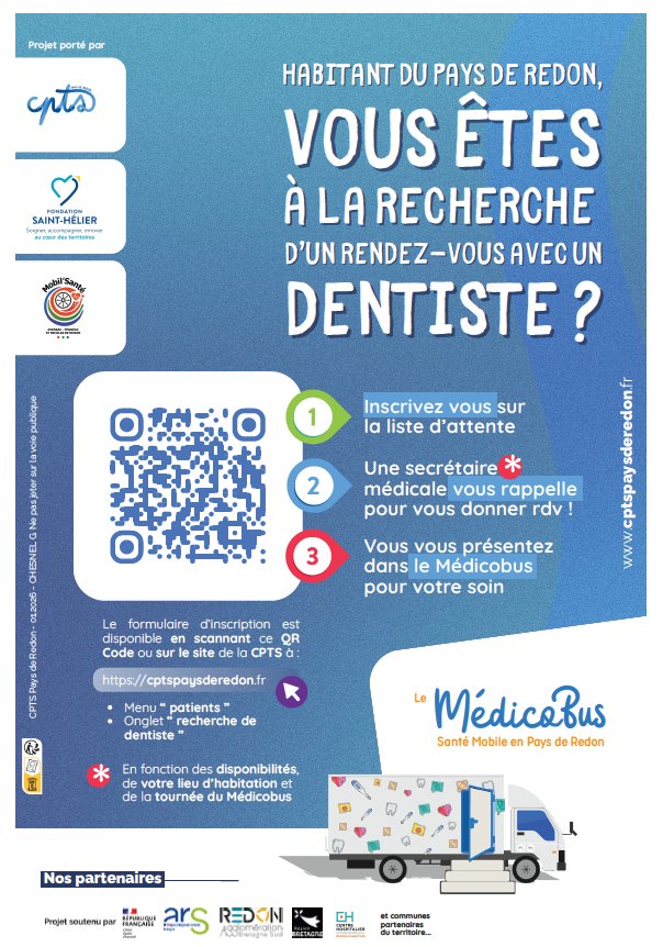 "Conscients des difficultés d’accès aux soins dentaires et de l’importance d’un suivi régulier, les professionnels de santé du Pays de Redon s’organisent pour faciliter la mise en relation entre les patients et les dentistes exerçant dans le Médicobus.