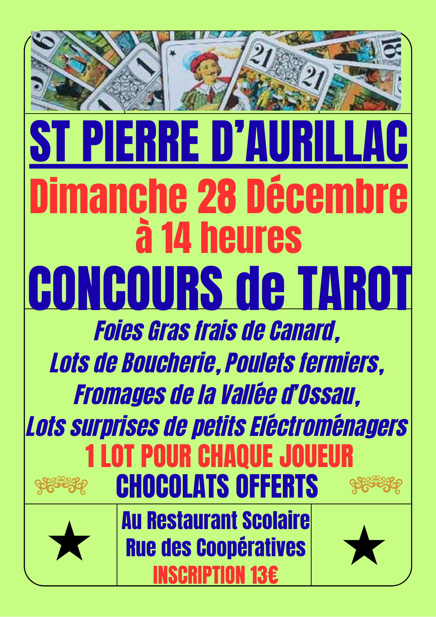 "Les Amis des Cartes de SAINT PIERRE D'AURILLAC" organisent un CONCOURS de TAROT, en donnes libres, ouvert à tout le monde, qui se déroulera le DIMANCHE 28 DECEMBRE à 14 heures au Restaurant Scolaire, situé rue des Coopératives à SAINT-PIERRE D'AURILLAC.