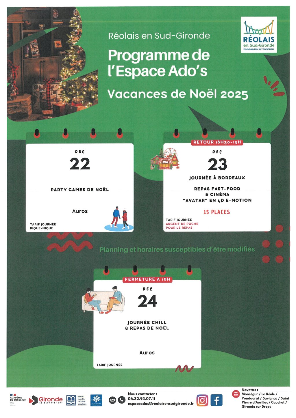 Programme de l'Espace Ado's - Vacances de Noël 2025