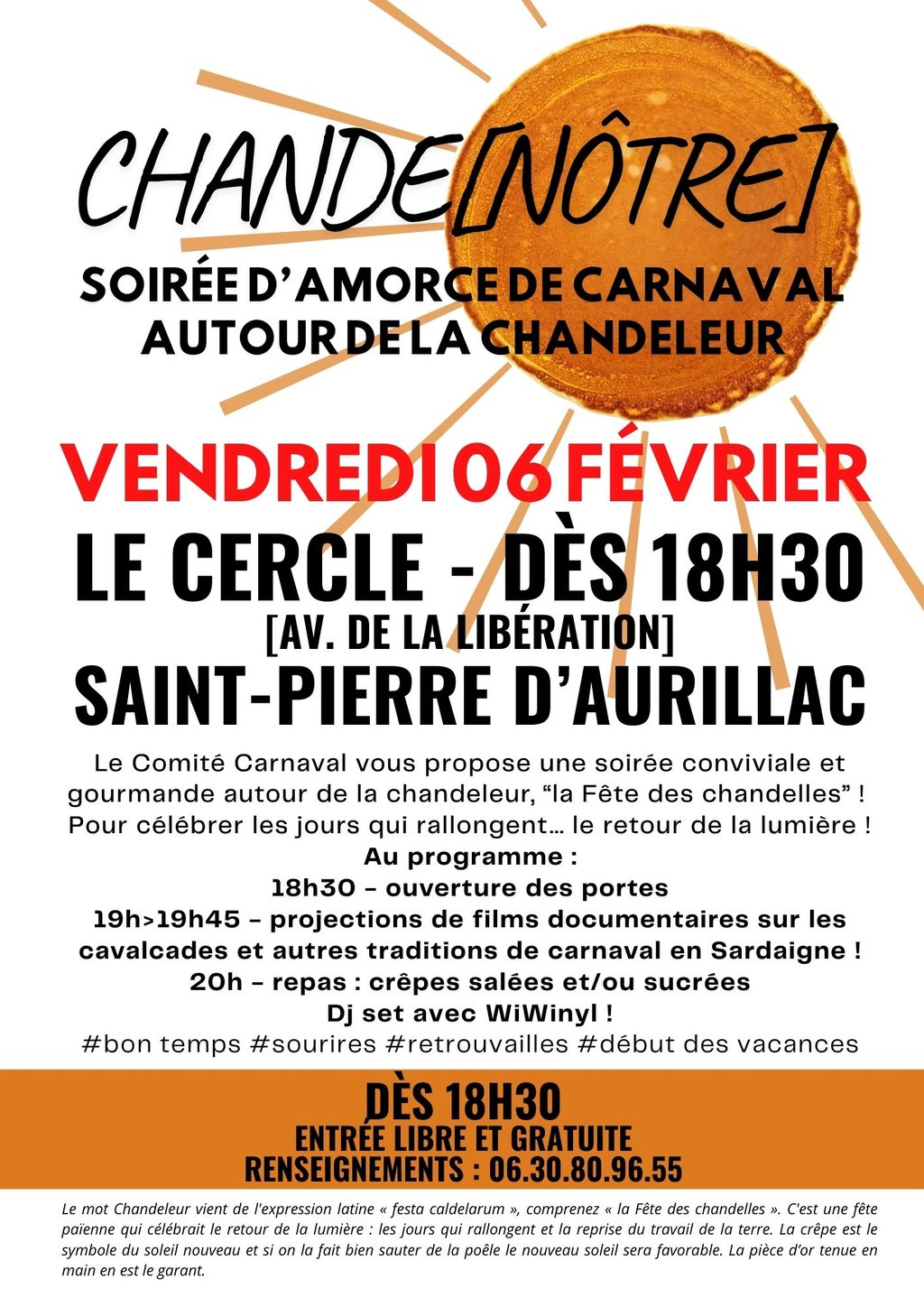 Afin de préparer la population à célébrer carnaval, le Comité Carnaval propose une soirée conviviale et gourmande autour de la chandeleur, “la Fête des chandelles” ! Pour célébrer les jours qui rallongent... le retour de la lumière !