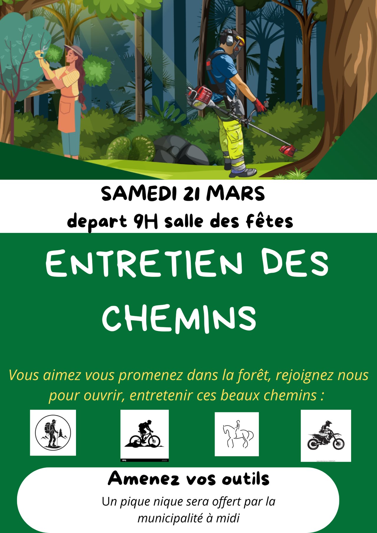 La municipalité vous propose de venir aider, dans une ambiance conviviale, à entretenir des chemins de randonnées.