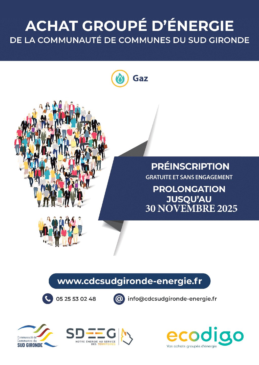 À l’initiative du SDEEG (Syndicat Départemental d’Énergies et d’Environnement de la Gironde), la Cdc du Sud Gironde relaie un achat groupé de gaz, accompagné par le prestataire ECODIGO, expert indépendant des achats groupés d’énergie.