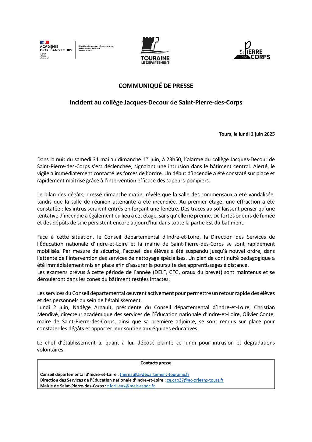 Suite à l'incident survenu dans la nuit du samedi 31 mai au collège Jacques-Decour, veuillez trouver le communiqué de presse en cliquant-ici.