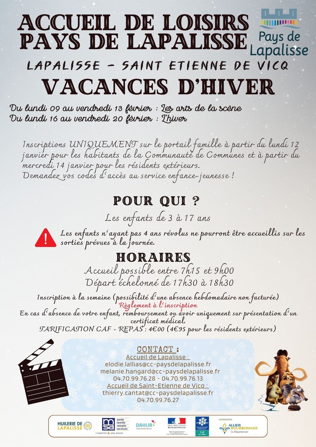 OUVERTURE DES INSCRIPTIONS ACCUEIL DE LOISIRS DU PAYS DE LAPALISSE - VACANCES D'HIVER