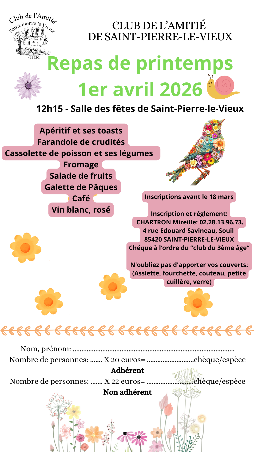 Veuillez vous inscrire avant le 18 mars 2026 au 02.28.13.96.76 ou en déposant le bon de réservation accompagné de son chèque à l'ordre du "club du 3ème age" au 4 rue Édouard Savineau à Souil, 85420 SAINT-PIERRE-LE-VIEUX