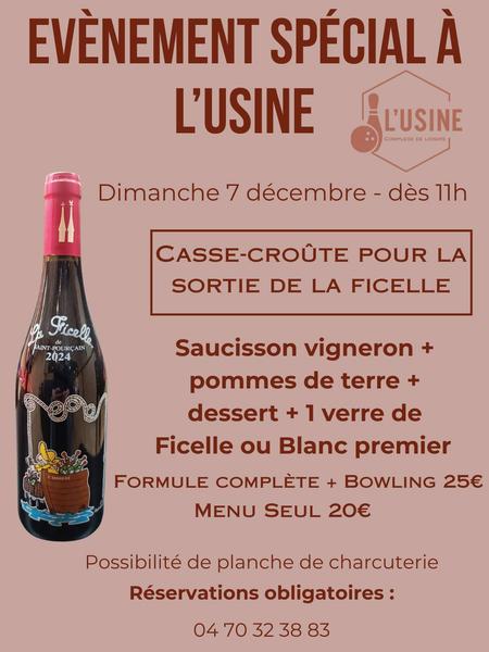 Célébrez la sortie de la Ficelle 2024 ! Profitez d'un Casse-Croûte gourmand (Saucisson vigneron, pommes de terre, dessert) avec un verre de Ficelle ou Blanc premier, et possibilité de Bowling. Réservation obligatoire.