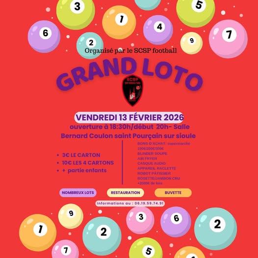 Grand Loto du SCSP Football le 13 février à St-Pourçain-sur-Sioule ! Nombreux lots : électroménager, bons d'achat, high-tech, panier garni.... Restauration & buvette sur place. Partie enfants.
