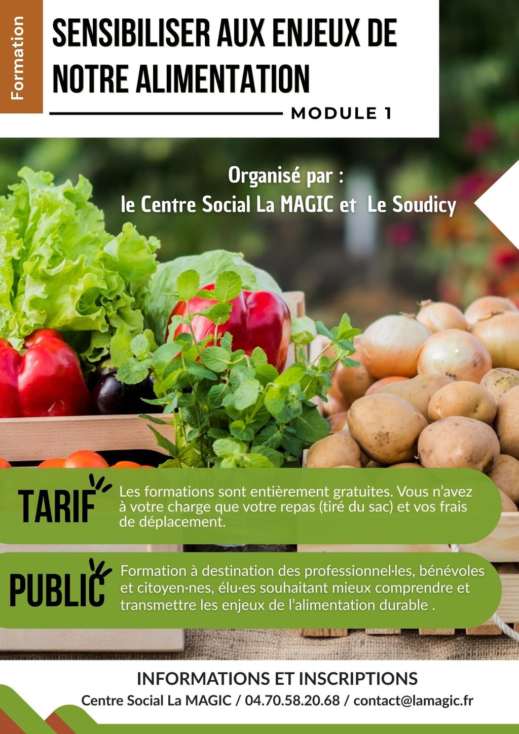 Le Centre Social La MAGIC et @le_soudicy vous invitent à participer au Module 1 : Comprendre les enjeux de l’alimentation durable, une formation dynamique et accessible à toutes et tous.
