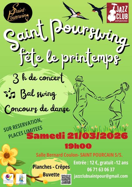 Le Jazz Club Saint-Pourcinois célèbre le printemps avec sa formation big band, le Saint Pourswing. Et quoi de mieux qu'un grand bal swing pour se mettre dans l'ambiance insouciante de la saison? Piste de danse, buvette, planches sur réservation.