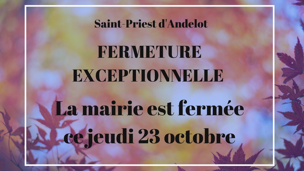 Nous vous informons que le secrĂ©tariat de la mairie de Saint Priest d'Andelot sera exceptionnellement fermĂ© aujourd'hui, jeudi 23 octobre 2025. đïžâ