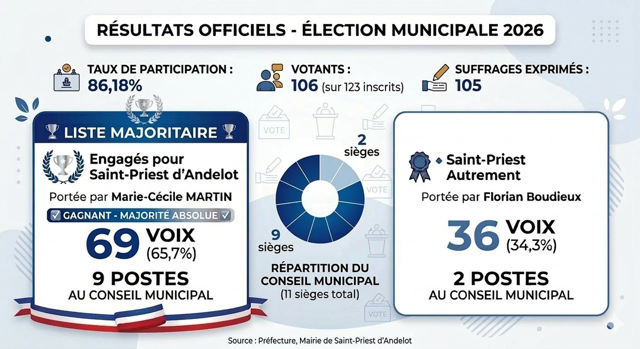 🏆 Liste "Engagés pour Saint-Priest d'Andelot" portée par Marie-Cécile MARTIN : 69 voix (65,7 %) = 9 postes