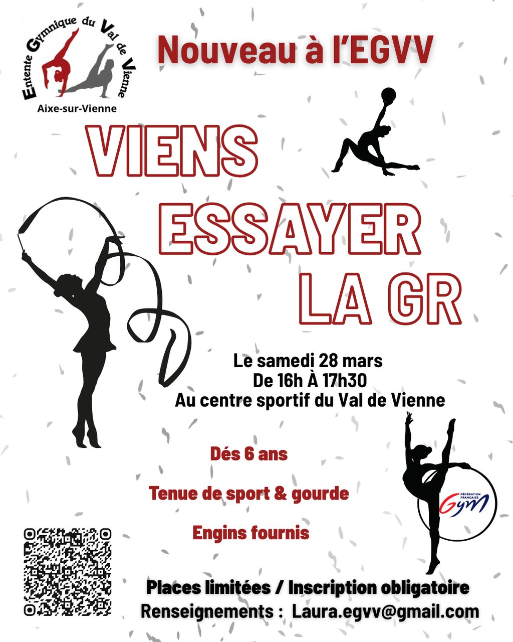 Le club de l’Entente Gymnique du Val de Vienne (EGVV) situé à Aixe-sur-Vienne a le projet d’ouvrir une section de gymnastique rythmique (GR). Afin d’évaluer l’intérêt des habitants pour cette discipline, une séance découverte est proposé sur inscription.