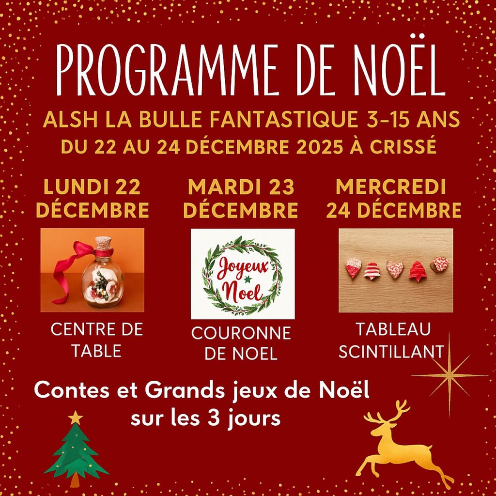🎅 Du 22 au 24 décembre à Crissé, l’ALSH La Bulle Fantastique propose trois journées festives pour les enfants de 3 à 15 ans :