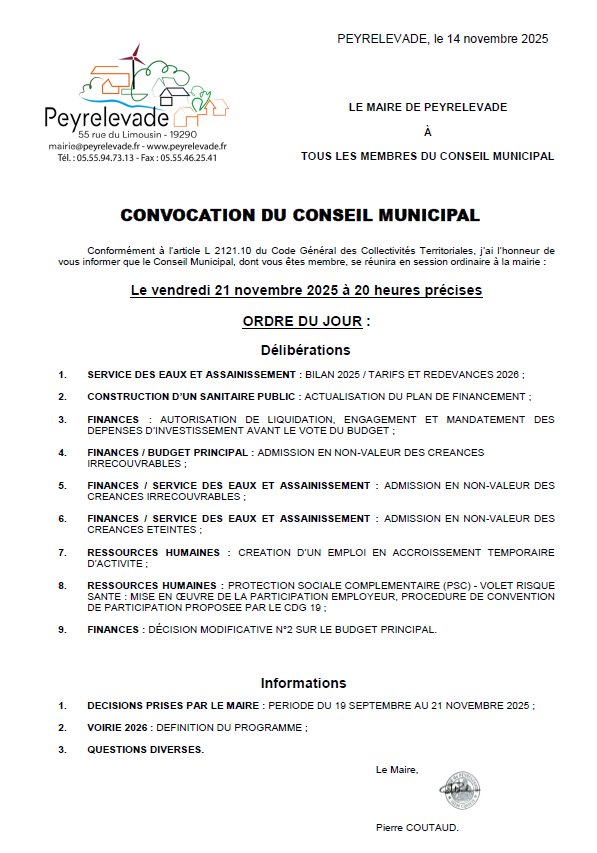 Voici l'ordre du jour du conseil municipal, le vendredi 21 novembre à 20h, à la mairie.