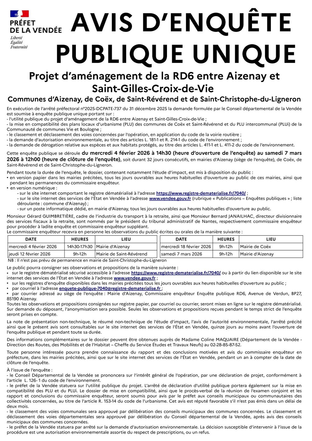 ENQUÊTE PUBLIQUE : PROJET D'AMÉNAGEMENT DE LA RD 6 ENTRE AIZENAY ET SAINT GILLES CROIX DE VIE