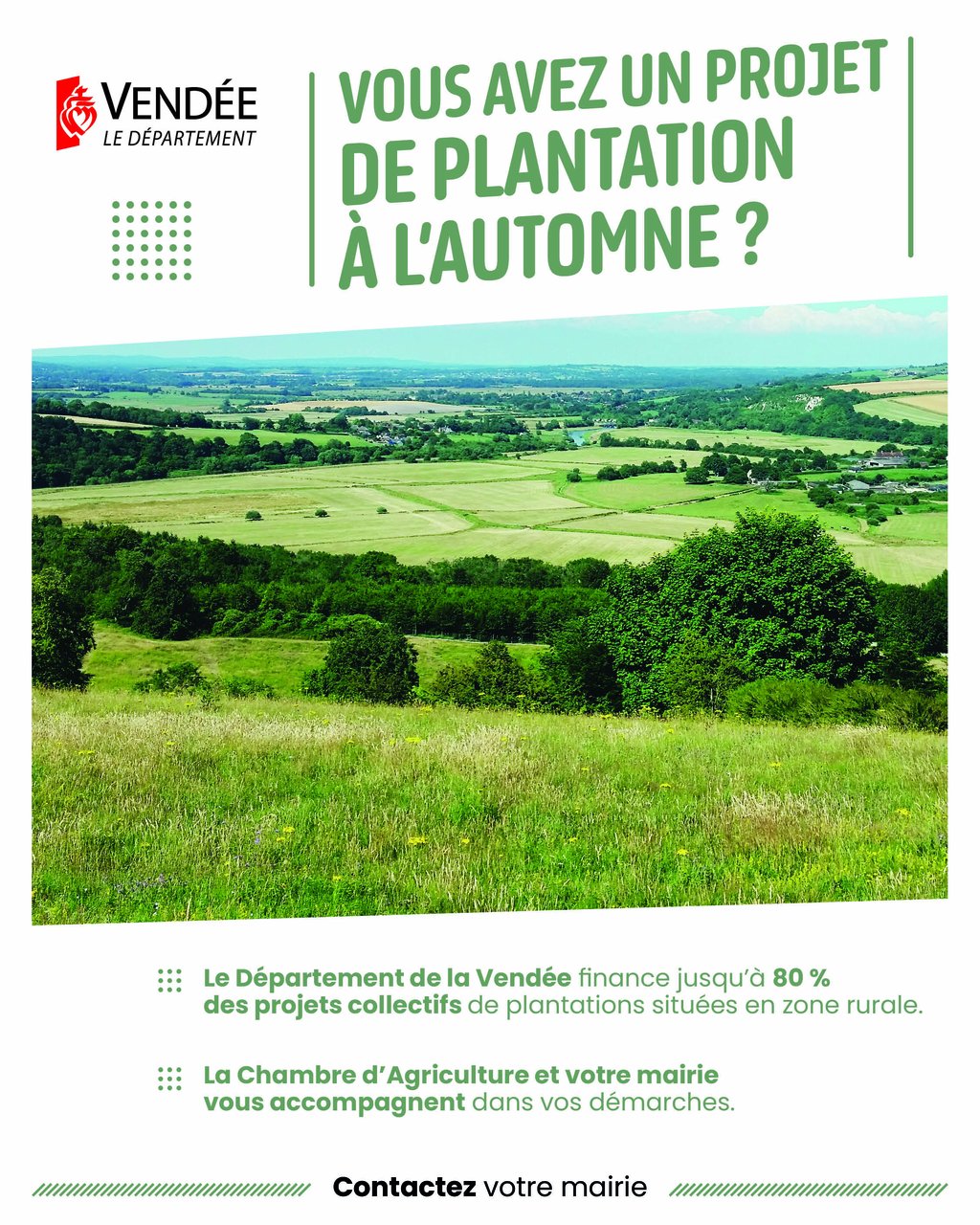 Le Département de la Vendée accorde des subventions aux collectivités pouvant atteindre 80 % des dépenses plafonnées, à condition de porter un projet collectif agricole. Celui-ci doit regrouper des exploitants agricoles et des particuliers, et concerner des plantations situées