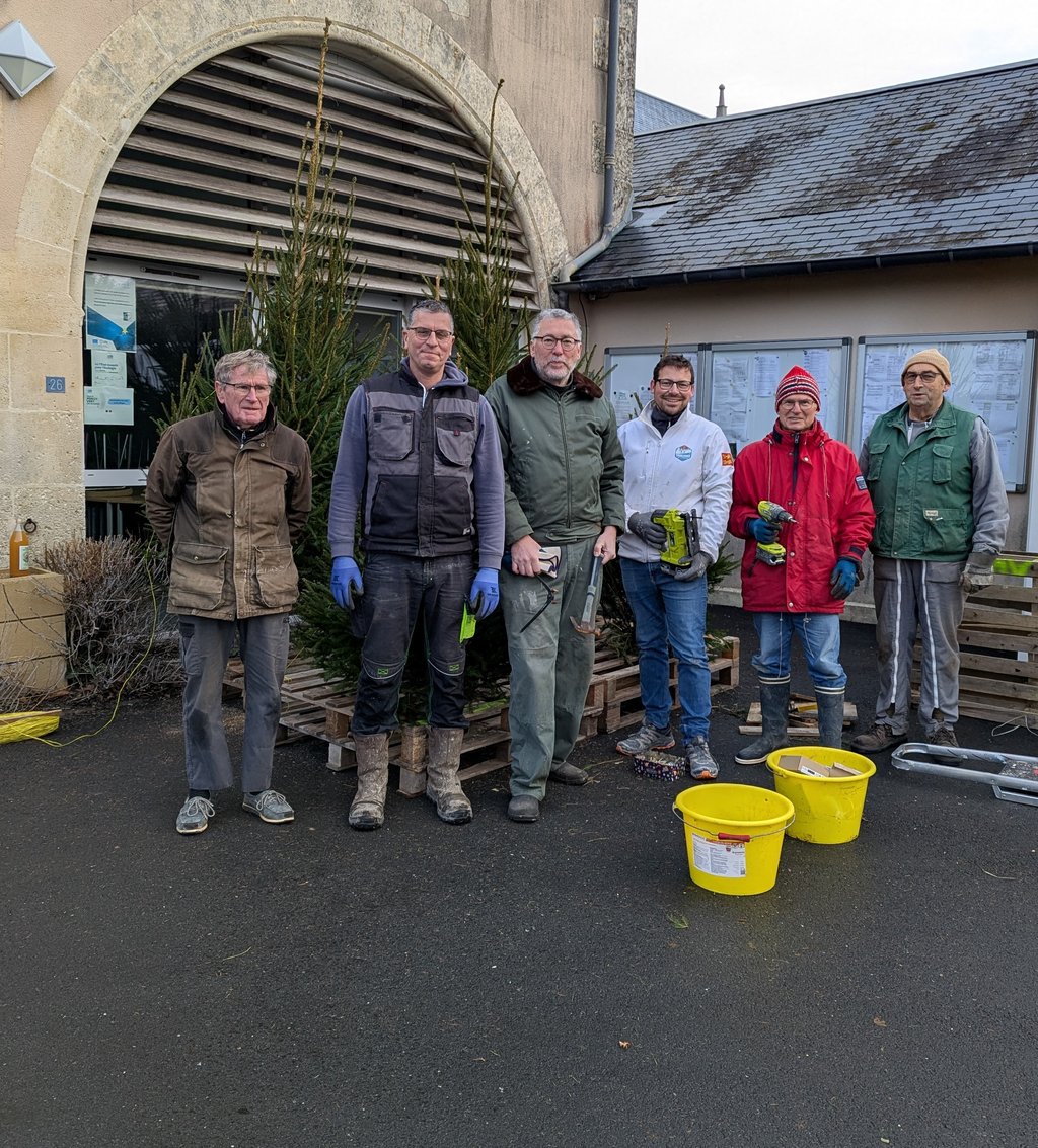 Comme chaque année, la fidèle et dynamique équipe municipale s’est mobilisée pour installer les sapins de Noël en différents points de la commune. De gauche à droite : Michel Bodin, véritable homme à tout faire dont la polyvalence n’est plus à démontrer ; Dimitri Barbin, notre responsable technique toujours précis et méthodique ; Olivier Jouanneau, adjoint au Maire, impliqué dans chaque étape ; Manuel Wacrenier, bricoleur professionnel et pilier indispensable de l’équipe ; Luc Hurtaud, spécialiste confirmé de l’haubanage, garant de la stabilité des installations ; et enfin Didier Barreau, Maire de la commune, présent pour coordonner et soutenir l’ensemble des opérations.