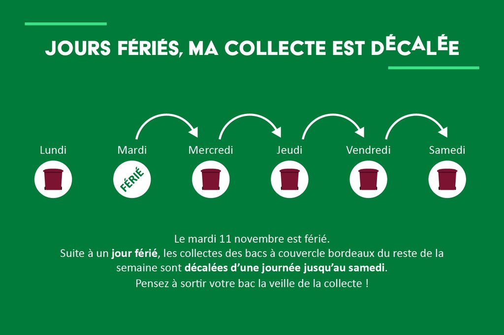 Le mardi 11 novembre est férié, la collecte des bacs ordures ménagères est décalée au lendemain, et ce, jusqu'au samedi.