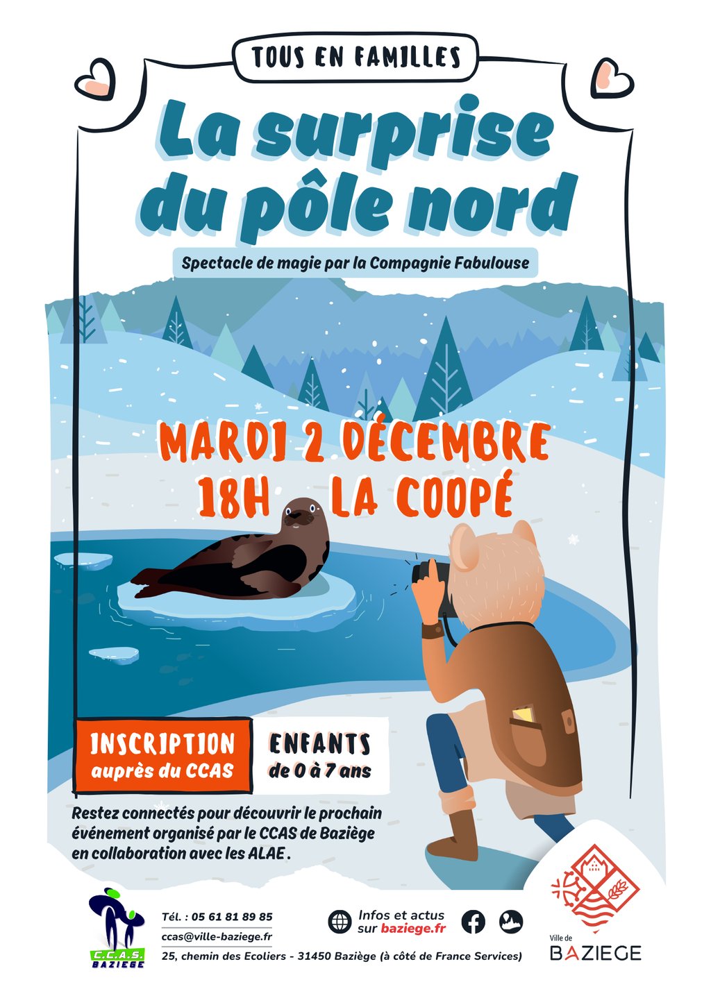 Le mardi 2 décembre à 18h dans la salle de La Coopé à Baziège, la Compagnie Fabulouse vous invite à assister en famille à un spectacle de Noël magique et poétique intitulé "La surprise du pôle Nord".