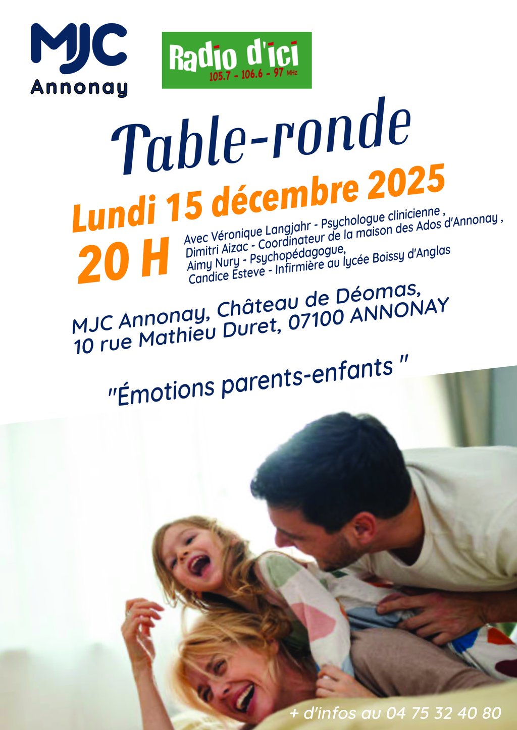 La MJC d’Annonay organise une table-ronde sur le thème “Émotions parents–enfants”, animée par plusieurs intervenants spécialisés dans l’accompagnement familial, l’enfance et la parentalité.