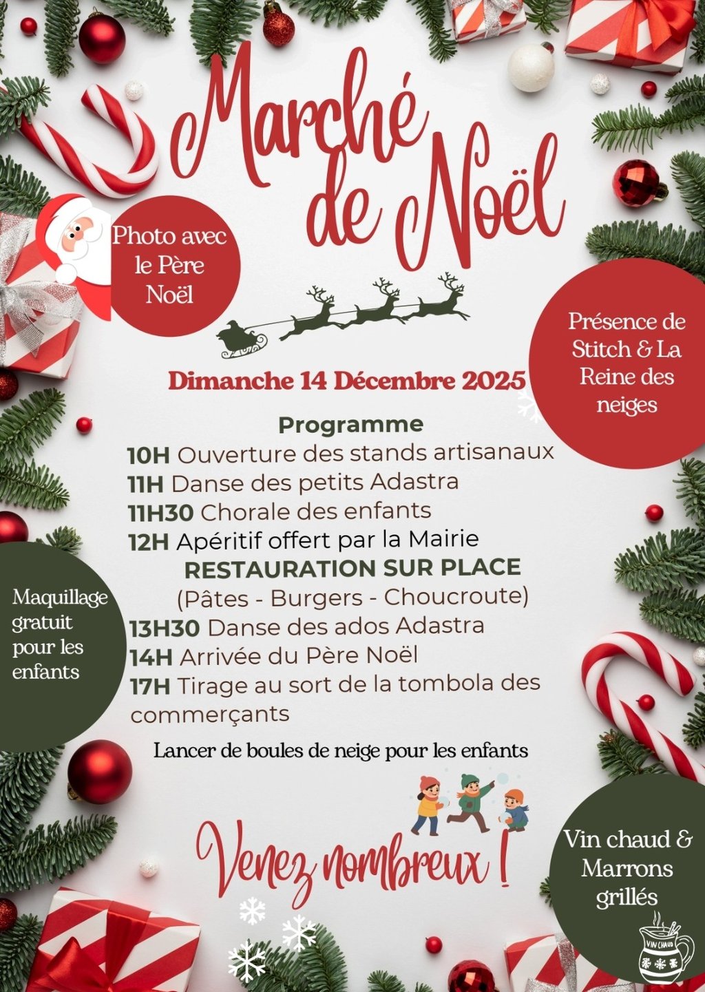 Comme chaque année, de nombreux stands artisanaux pour vos idées cadeaux mais aussi le Père Noël, la Reine des Neiges, Stitch.