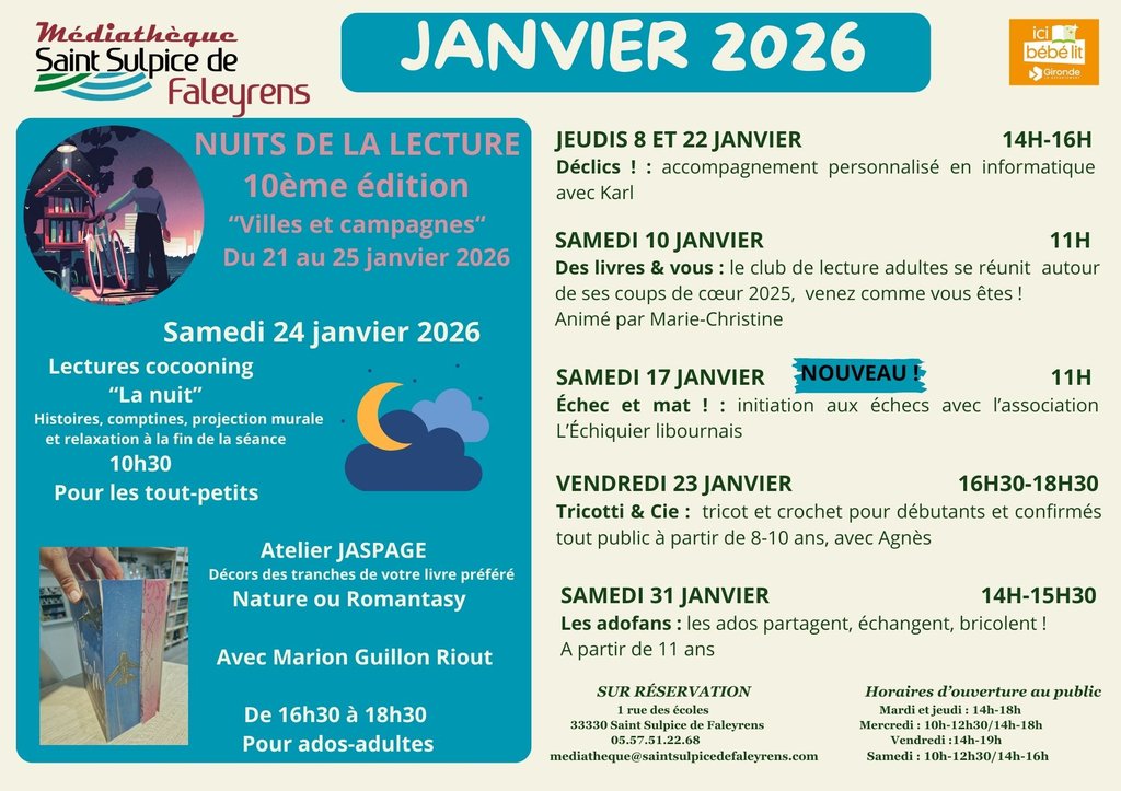 Nouvelle année et premier mois de programmation à la médiathèque avec un nouveau rendez-vous (initiation aux échecs) et le retour des Nuits de la lecture pour la 10ème édition sur la thématique "Villes et campagnes".