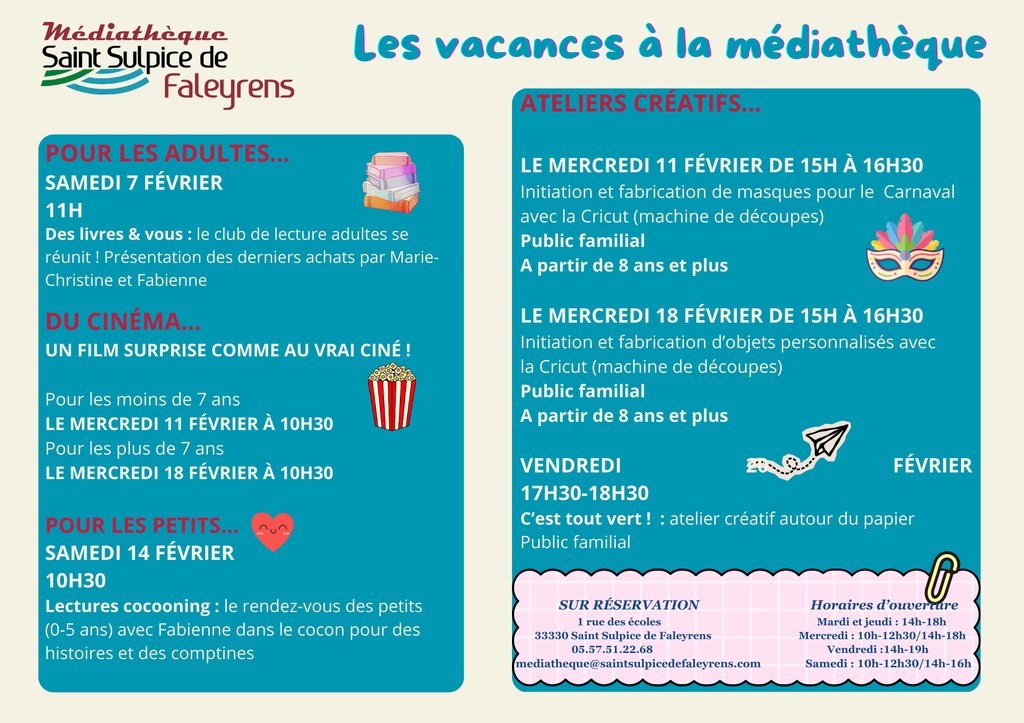 La médiathèque reste OUVERTE aux horaires habituels durant les prochaines vacances et propose de multiples animations : il y en a pour tous les goûts !