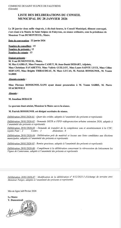 LISTE DES DELIBERATIONS DU CONSEIL MUNICIPAL DU 28 JANVIER 2026