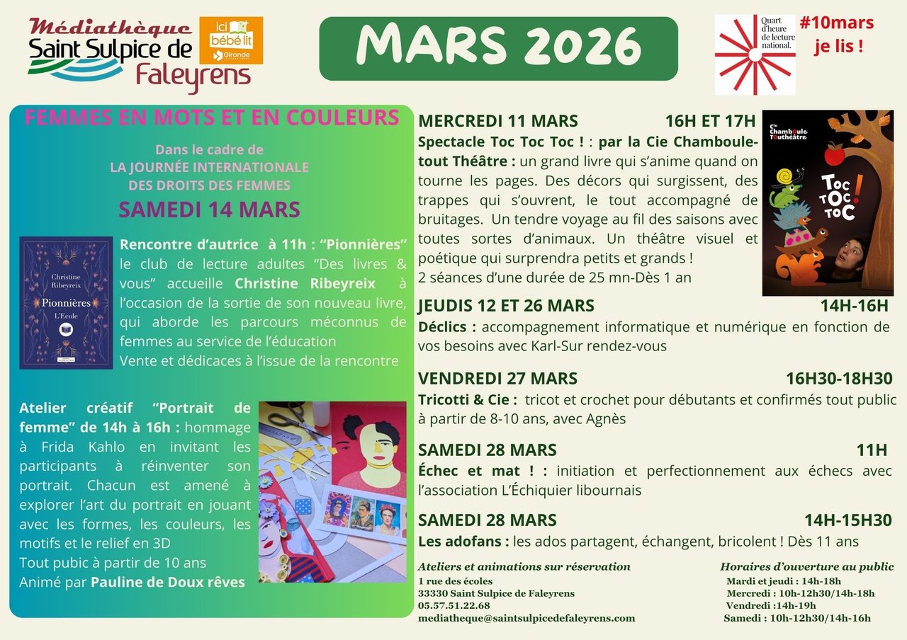 Les beaux jours arrivent et avec eux, la nouvelle programmation de mars-avril désormais disponible : un mois de mars sous le signe des femmes avec deux animations et un spectacle pour les enfants à partir de 1 an avec deux séances, et bien sûr nos rendez-vous réguliers : informatique, tricot/crochet, échecs et club ados.