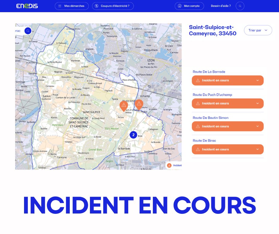 Une coupure d’électricité est actuellement signalée sur la commune de Saint-Sulpice-et-Cameyrac.