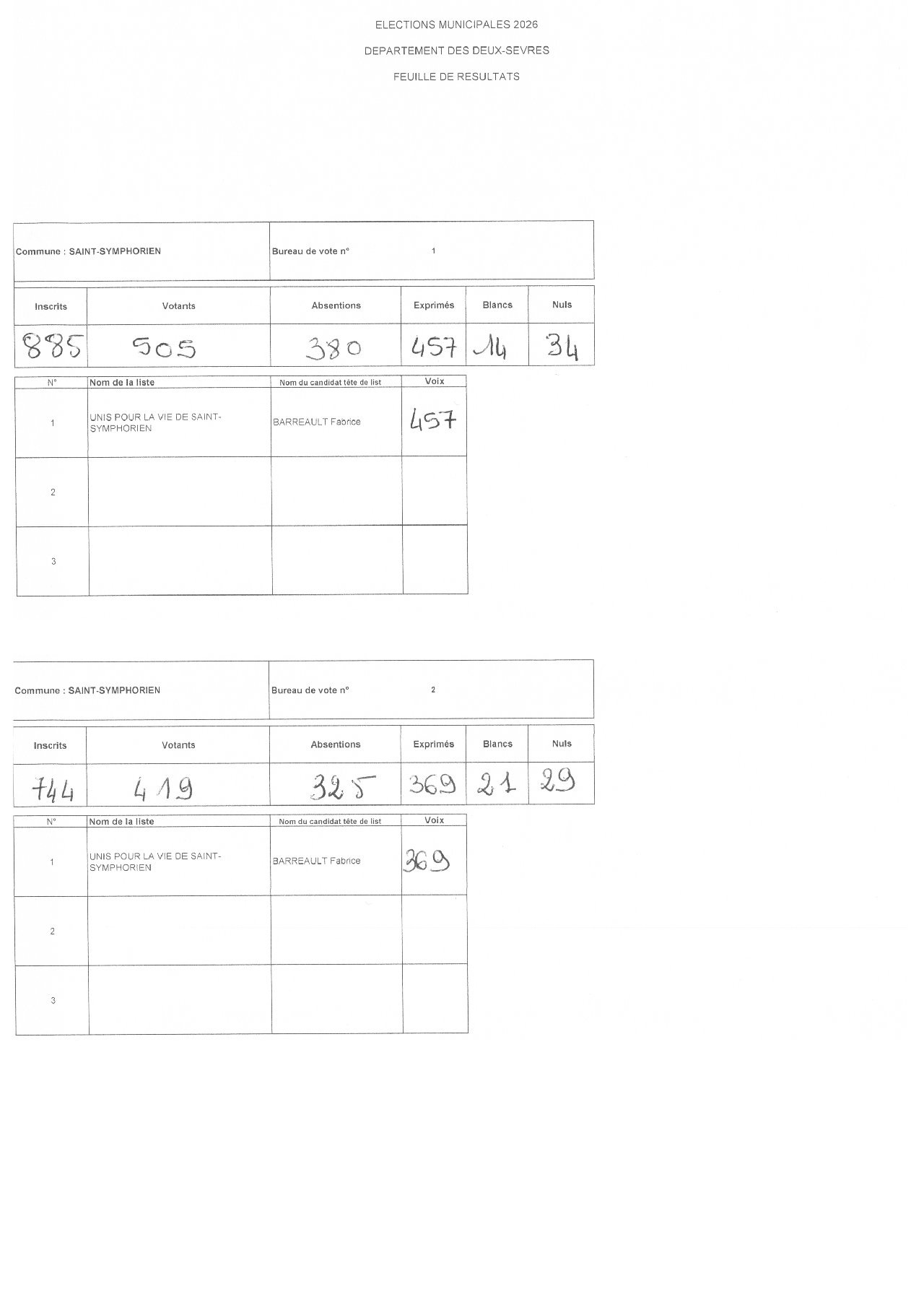 ÉLECTIONS MUNICIPALES - RÉSULTATS DES BUREAUX DE VOTE 1 ET 2